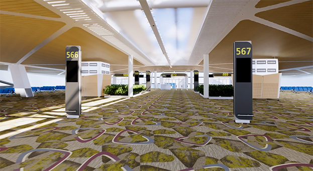 衛(wèi)星廳雖然是T3航站樓國(guó)內(nèi)候機(jī)指廊的延伸,但也需要體現(xiàn)其內(nèi)在價(jià)值和特色。與T3航站樓相比,衛(wèi)星廳建筑規(guī)模和體量都小。衛(wèi)星廳以實(shí)用性和旅客體驗(yàn)為特點(diǎn),因此更適合采用木色等天然材質(zhì)的作為空間主要色調(diào),積極打造深圳機(jī)場(chǎng)衛(wèi)星廳為一個(gè)明亮、溫馨、具有自然質(zhì)感、親切的航站樓。鋪地主要采用整體無(wú)縫磨石地坪、高端無(wú)機(jī)人造石、地毯打造,鋪地根據(jù)建筑功能,整體無(wú)縫磨石地坪主要分布三層及二層中央出港區(qū)域,地毯主要分布在三層各個(gè)指廊候機(jī)區(qū)域。其余區(qū)域鋪地為高端無(wú)機(jī)人造石。