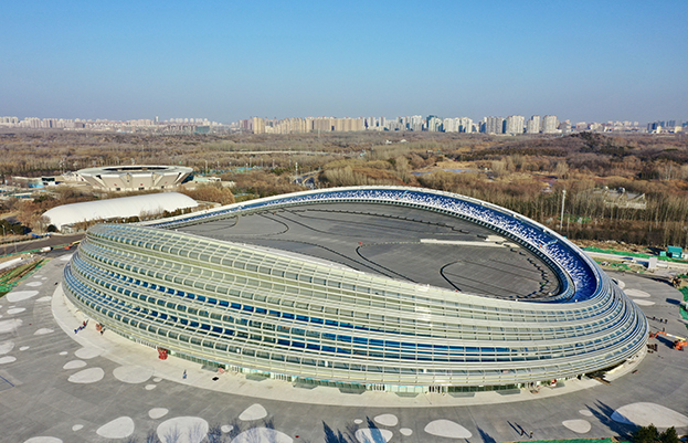 國家速滑館是北京2022年冬奧會(huì)北京賽區(qū)新建的標(biāo)志性場館,位于奧林匹克森林公園南園西北側(cè),北鄰國家網(wǎng)球中心,東臨奧林西路、西臨林萃路。速滑館屋面外緣設(shè)有建筑一體化的太陽能光伏電力系統(tǒng),藍(lán)色的單元電池板自屋頂外邊緣向內(nèi)側(cè)漸變排列,如同正在融化的雪,展現(xiàn)冬季運(yùn)動(dòng)的特色。